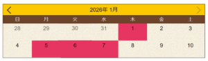 第1週:2日(火)・3日(水)は通常通り定休日になります。